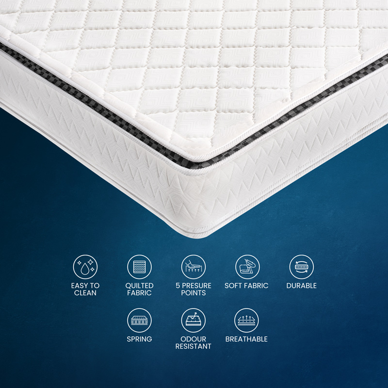 Mehran’s Esquire Pillow Top mattress offers the ultimate luxury and comfort for a restful night’s sleep. Featuring a pillow top layer that provides extra cushioning, this 10-inch mattress combines a breathable fabric and high-quality support core to ensure durability and long-lasting performance. Its design promotes proper spinal alignment and offers effective pressure relief, making it ideal for users seeking a comfortable sleep solution. Available in a single mattress, queen-size mattress, and king-size mattress options, this mattress delivers the perfect balance of softness and stability for those looking for the best pillow top mattresses in Pakistan.