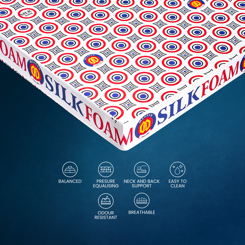 Elevate your rest with Mehran’s Silk mattress, a true masterpiece! This foam mattress is crafted using high-quality breathable fabric, and top-tier materials for contemporary utility. Its innovative foam layer enables quick transition to deep sleep, reducing discomfort for a more rejuvenating rest. The breathable fabric adds to its luxury, preventing discomfort and overheating. Available in single, queen, and king-size mattress options, the Silk mattress is built for long-lasting durability and optimal comfort. With a non-slip fabric underneath, this mattress stays securely in place, ensuring steady, uninterrupted sleep. Choose Mehran’s Silk mattress for an unparalleled blend of softness, support, and durability.